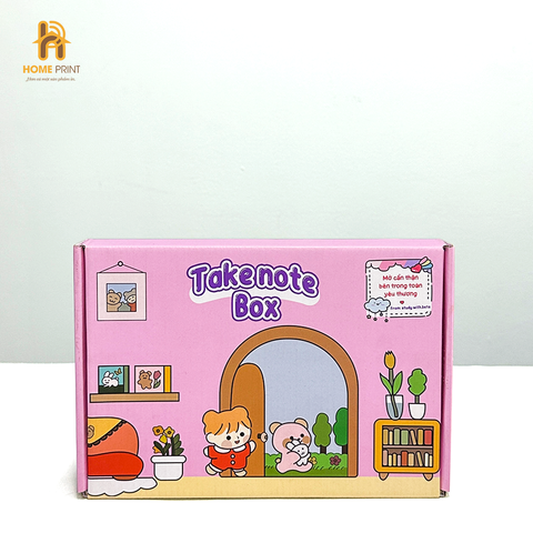 Hộp giấy đựng Take Note Study With Beta với thiết kế dễ thương, toàn bộ hộp được bao phủ bởi màu hồng nhạt nịnh mắt, cùng các hình ảnh vui tươi được bố trí trên nền hộp tạo cho khách hàng cảm giác vui nhộn và đáng yêu.